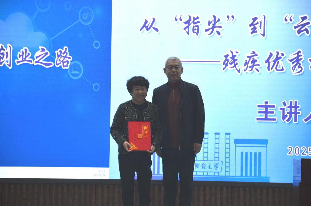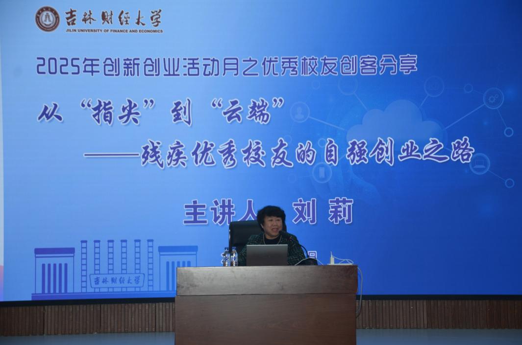 本网讯(青瓴双创会·张艺茹·彭思涵)为深化创新创业教育改革,培育学子创新精神与创业能力,10 月 29 日,吉林财经大学在新经济(数字经济)创新创业实训中心报告厅举办2025年创新创业活动月系列活动——优秀校友创客分享会。1990 届会计专业校友刘莉受邀以《从 “指尖” 到 “云端”——残疾优秀校友的自强创业之路》为题,分享创业经验。
